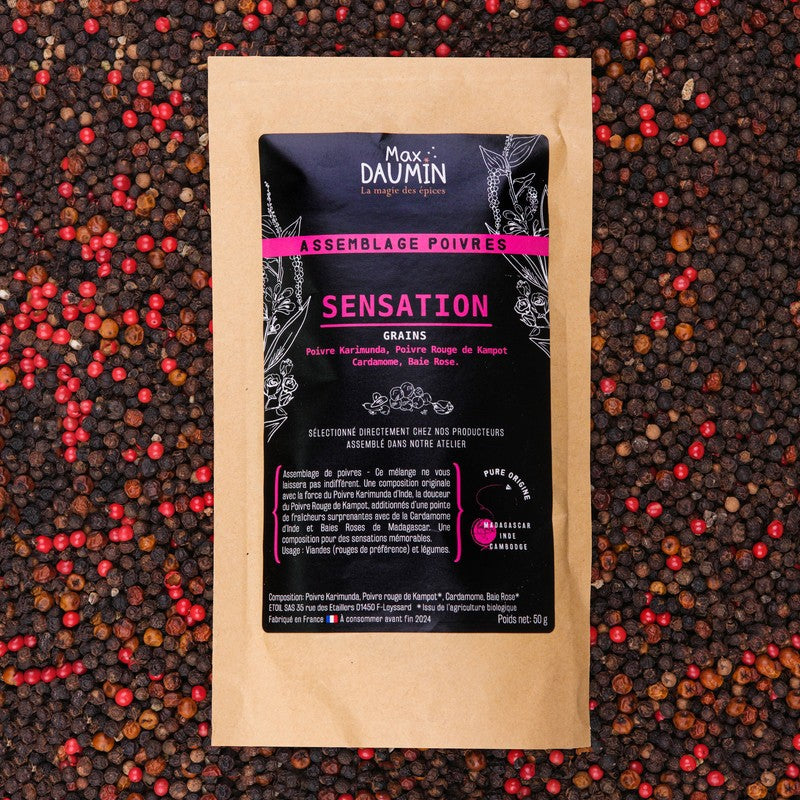Une composition originale avec la force du Poivre Karimunda d'Inde, la douceur et la subtilité du Poivre Rouge de Kampot, additionnés d'une pointe de fraicheurs surprenantes avec de la Cardamome d'Inde et Baies Roses de Madagascar.