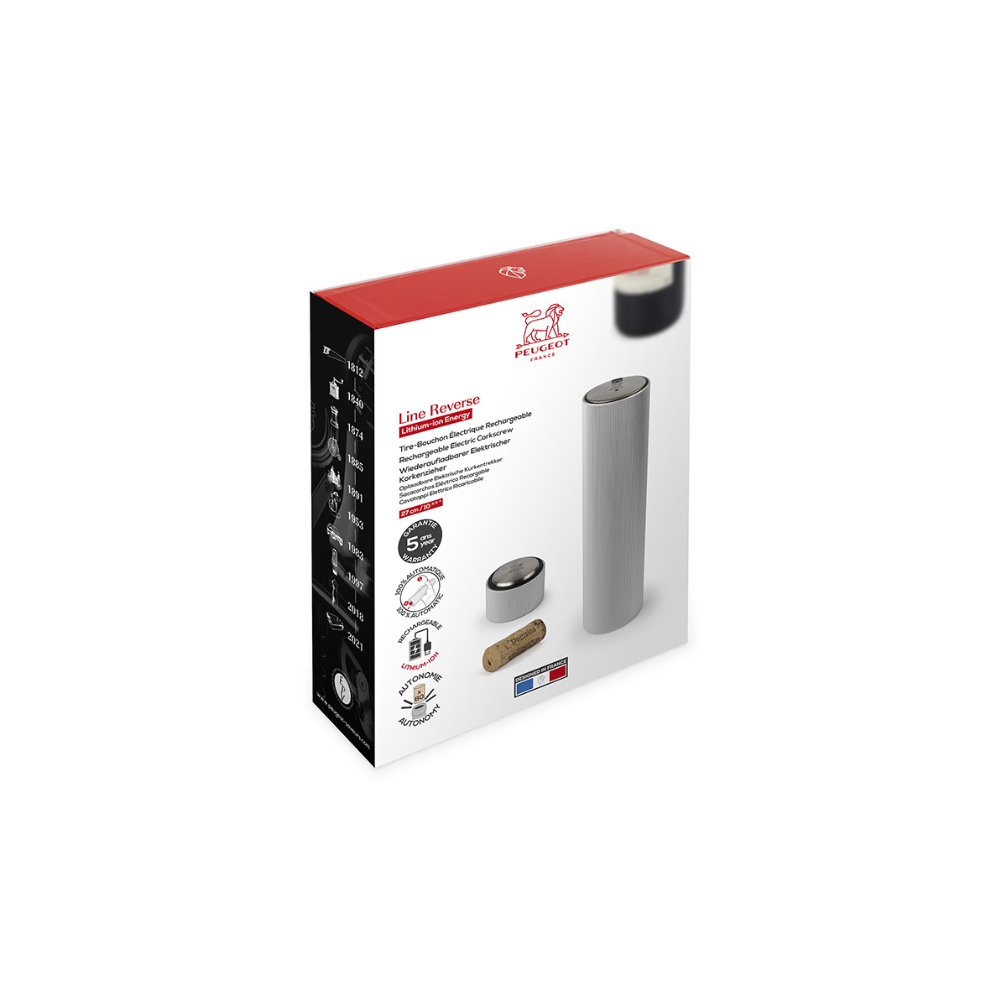 Le tire-bouchon électrique Line Reverse de Peugeot permet une ouverture de bouteille facile et automatique par simple pression sur le goulot. Il éjecte le bouchon d’un simple mouvement du poignet et dispose d'une batterie Lithium-ion offrant jusqu'à 80 extractions et une charge rapide de 2h30. Son design moderne inclut un coupe-capsule en aluminium et il est garanti 5 ans.