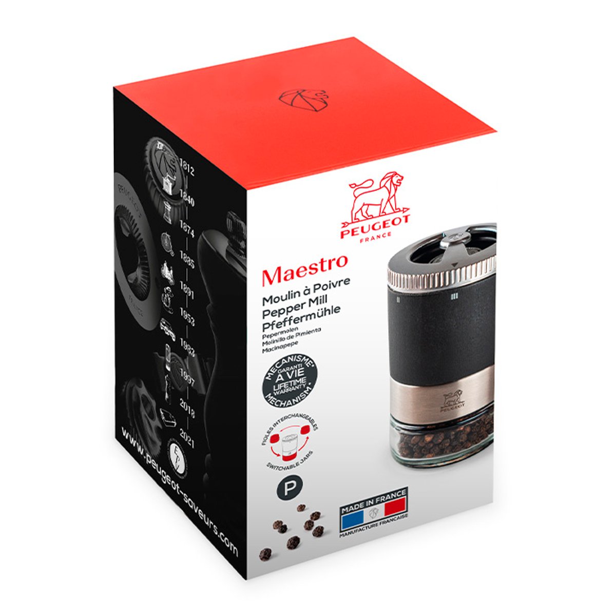 Le moulin Maestro de Peugeot, conçu pour le Bar à poivres, allie bois PEFC et verre. Il est doté du système u'Select pour un réglage facile de la mouture, de la plus fine à la plus grosse. Son réservoir en verre est dévissable et interchangeable, permettant l’utilisation de différents poivres. Ce moulin, garanti 5 ans, est fabriqué en France avec des matériaux durables. Il est compatible avec poivres et graines comme la coriandre.