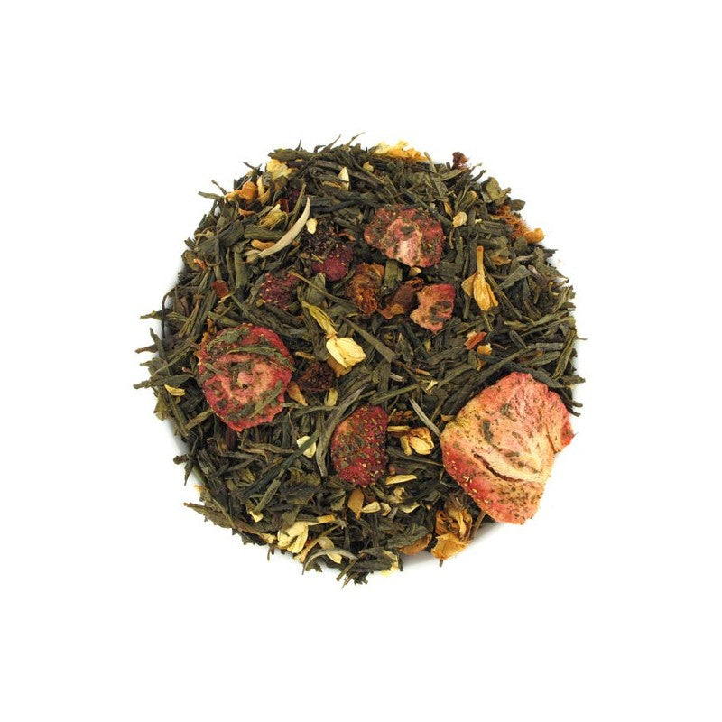 Thé vert, thé blanc,fleur de jasmin, morceaux de fraise, camomille romaine, arôme de vanille