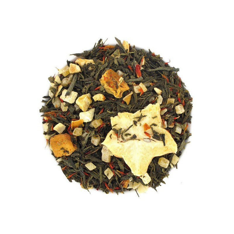 Thé vert, mangue cubes, écorce d'orange, tranches de carambole, arômes, pétales de carthame
